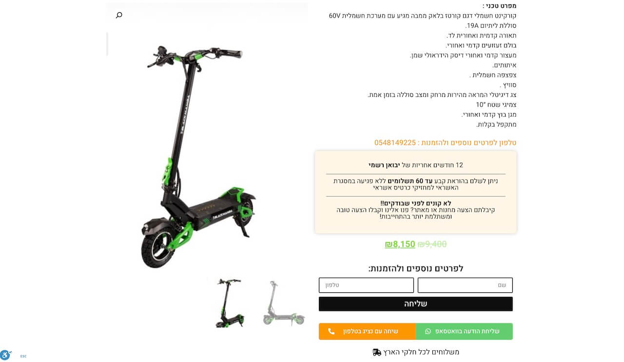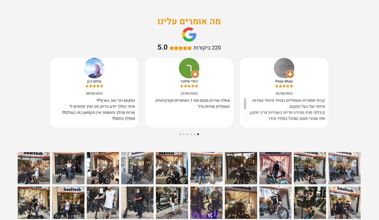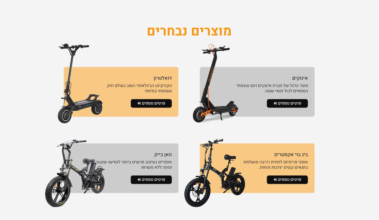 האתר עצמו, גם מבחינה עיצובית וגם מבחינת התוכן מכוון בעיקר לצרכנים שכבר יודעים שהם מעוניינים לרכוש את המוצר: אופניים חשמליים או קורקינט. הנחת היסוד מאחורי האסטרטגיה השיווקית, היא שאלו לא צרכנים שצריך להרשים אותם, ולכן הלכנו על עיצוב בייסיק אבל קלאסי. היה לנו חשוב, בעיקר ליצור אתר מהיר ולאפשר ללקוחות לסנן ביעילות את המוצר שמתאים להם, כדי להשאיר פניה ולרכוש את המוצר (או לשאול את הנציג בטלפון שאלות).